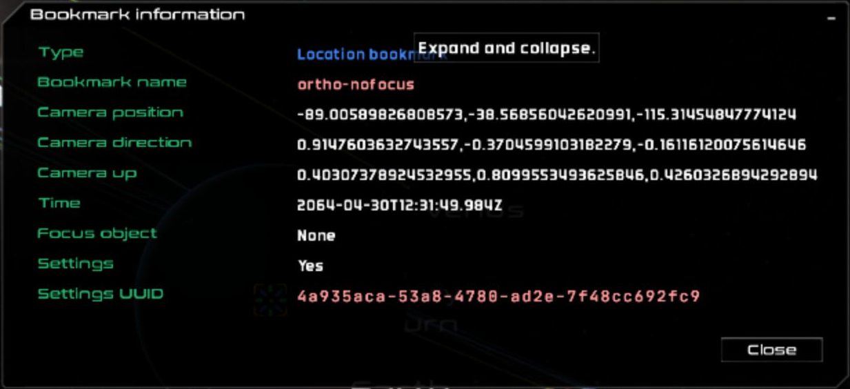 The bookmarks pane contains the bookmarks tree. Bookmarks are optionally organized into directories or folders. Activate a bookmark by clikcing on it. For object bookmarks, the focus object is set when the bookmark is activated. For location bookmarks, the camera position, orientation, the time, the focus, and the settings are applied when the bookmark is activated.