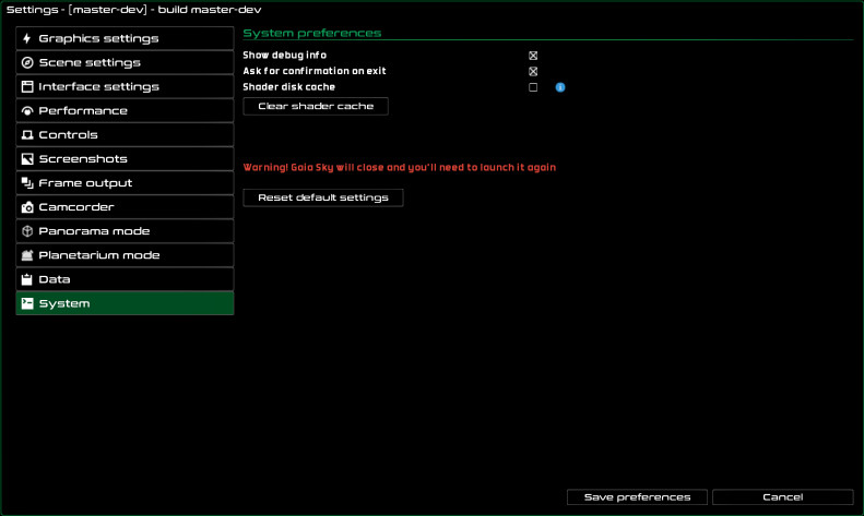 Reset default settings – revert to the default settings. You will lose your current settings file and Gaia Sky will need to be relaunched for the changes to take effect.