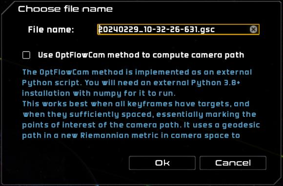 Export… – export the current project to a camera path file .gsc. Optionally, the OptFlowCam method can be used to export. The export process uses the settings defined in the kefyrame preferences. You can choose the file name, but not the directory. If another file with the same name exists, a unique file name is generated from the given one.